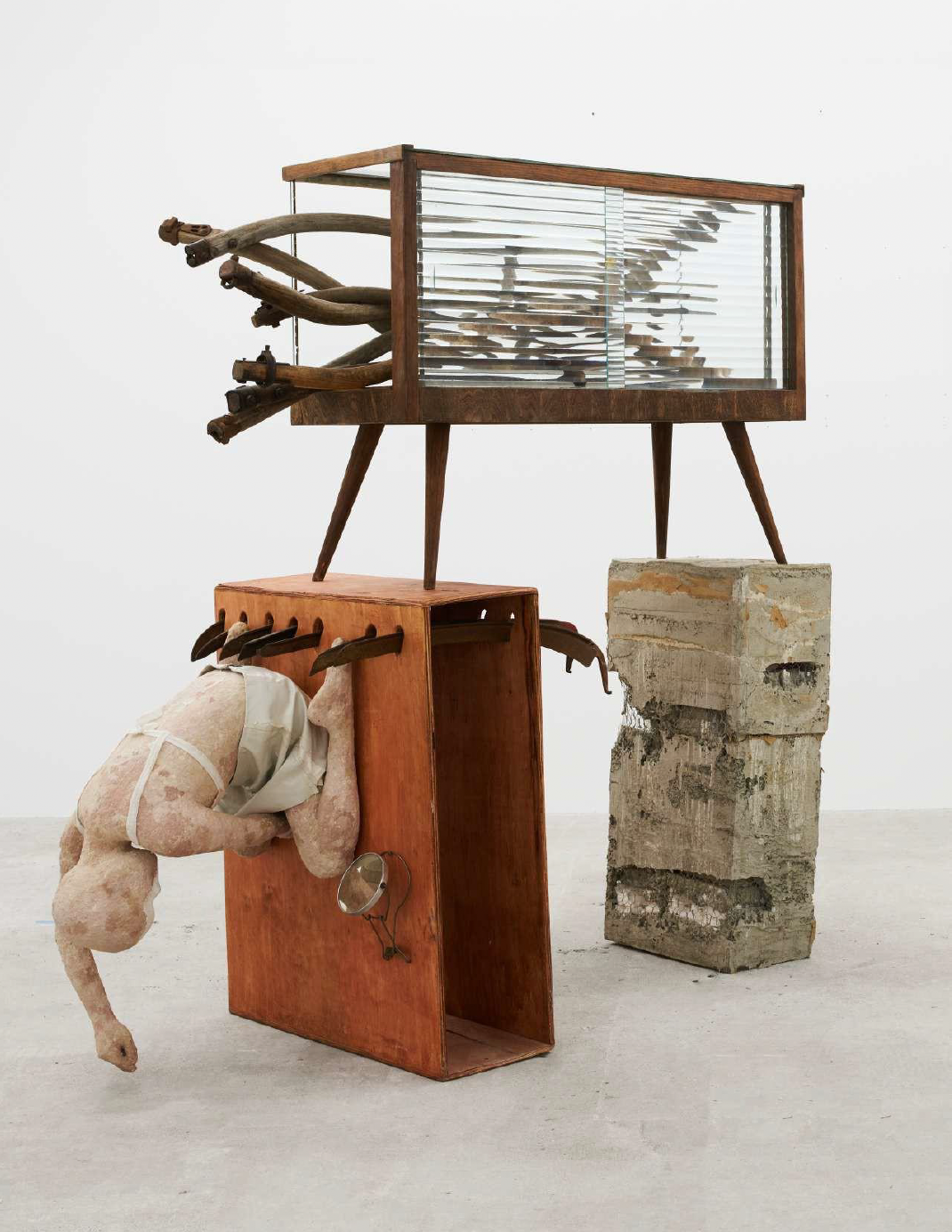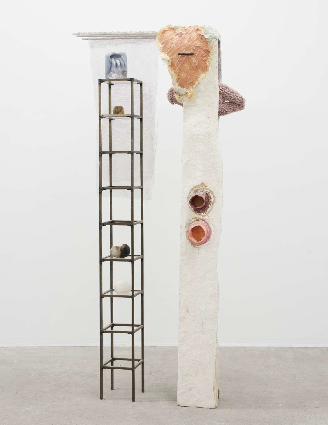 syndrome, 2023. Papier mache, textile, discarded elements, steel, brass, oil paint, paper, oak, pine, pet staircase, acrylic gel transfer, hardware, wire mesh, wool roving, plastic, resin. Courtesy of the artist.