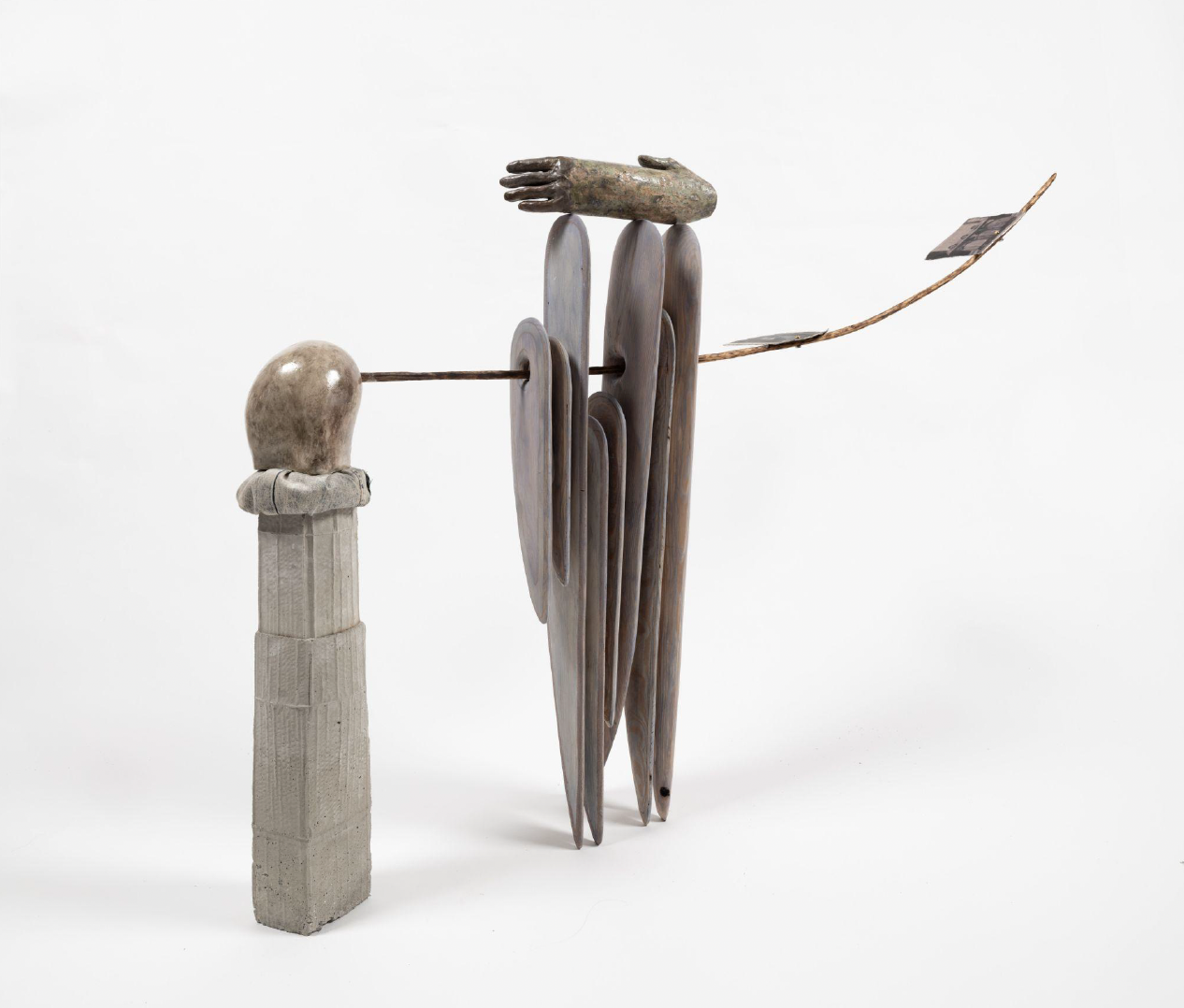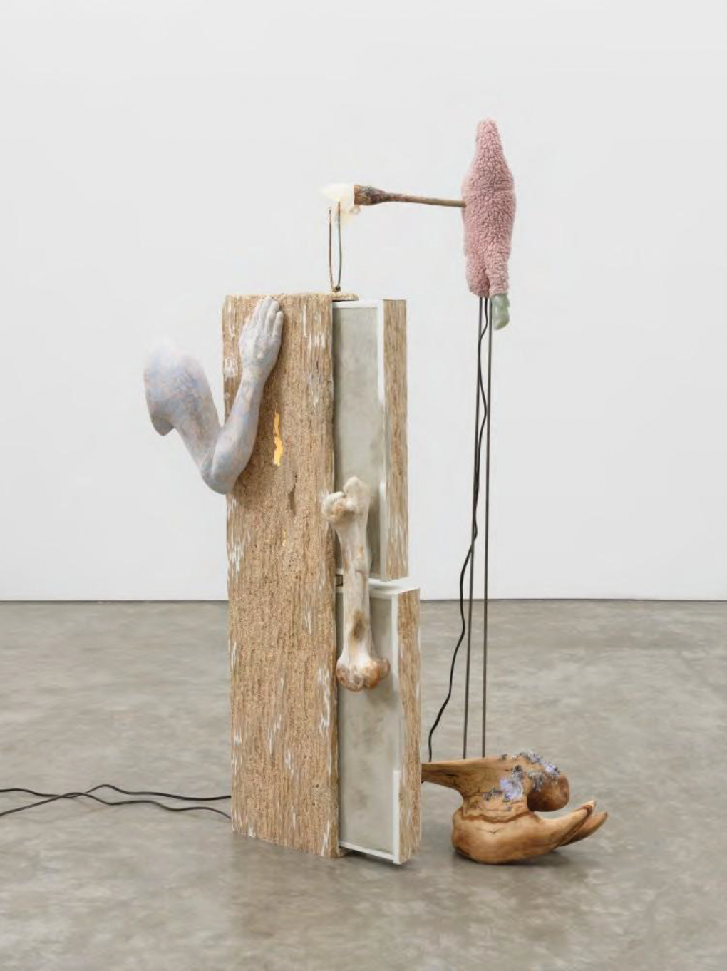 Lamia, 2023. Concrete, plaster, pine, plywood, pigment, textile, papier mache, epoxy clay, hardware, gel medium transfers on aluminum. 40 x 58 x 8 inches. Courtesy of the artist.
