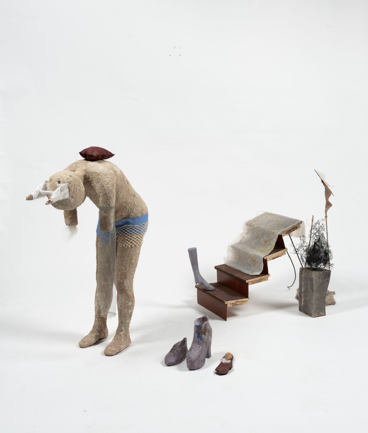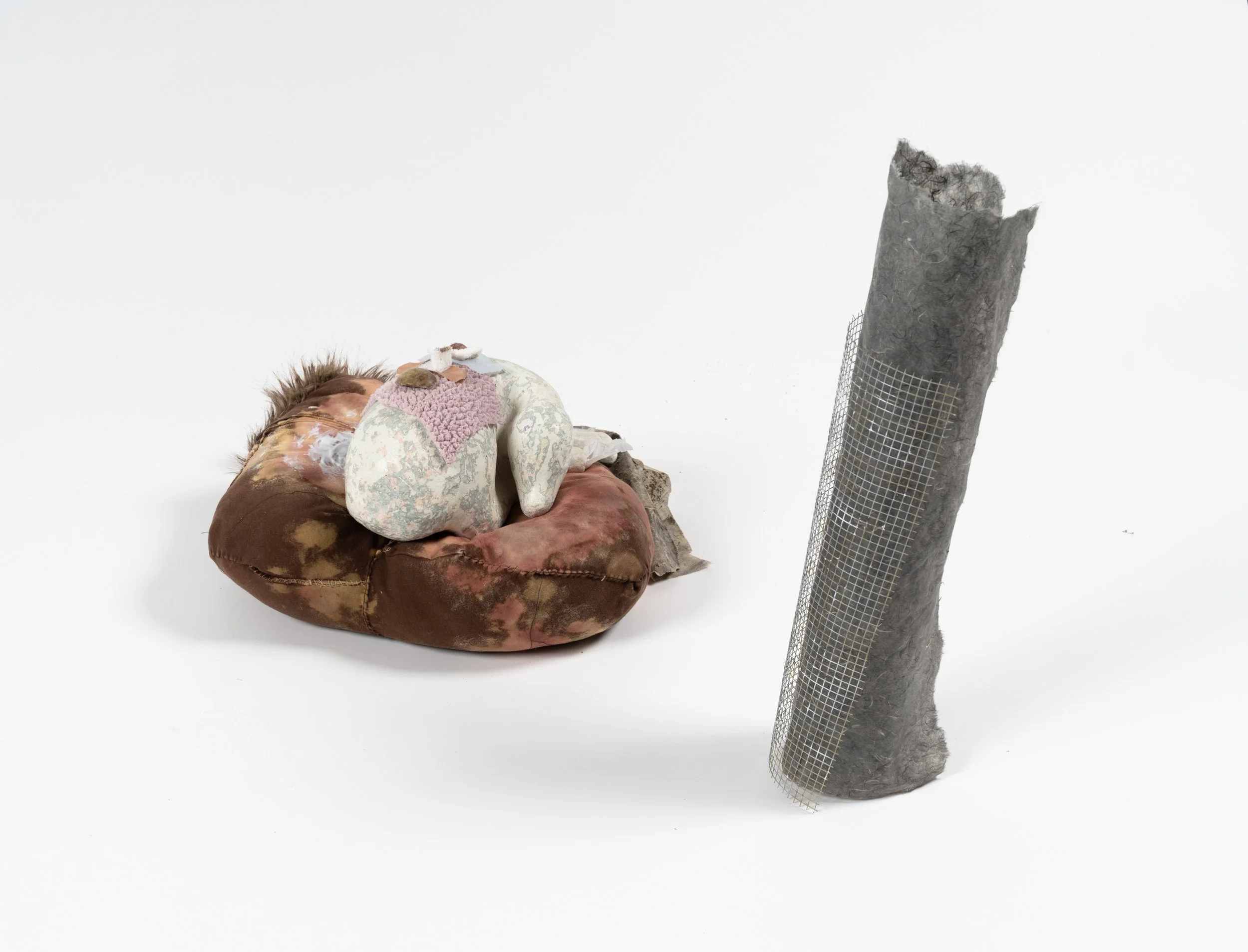 Pity, 2023. Papier mache, plaster, textile, bleach, dye, wire mesh, paper, shellac, wood, pigment, digital print, gauze, tape, blood, soapstone, toothpaste 21 x 24 x 28 inches. Courtesy of the artist.