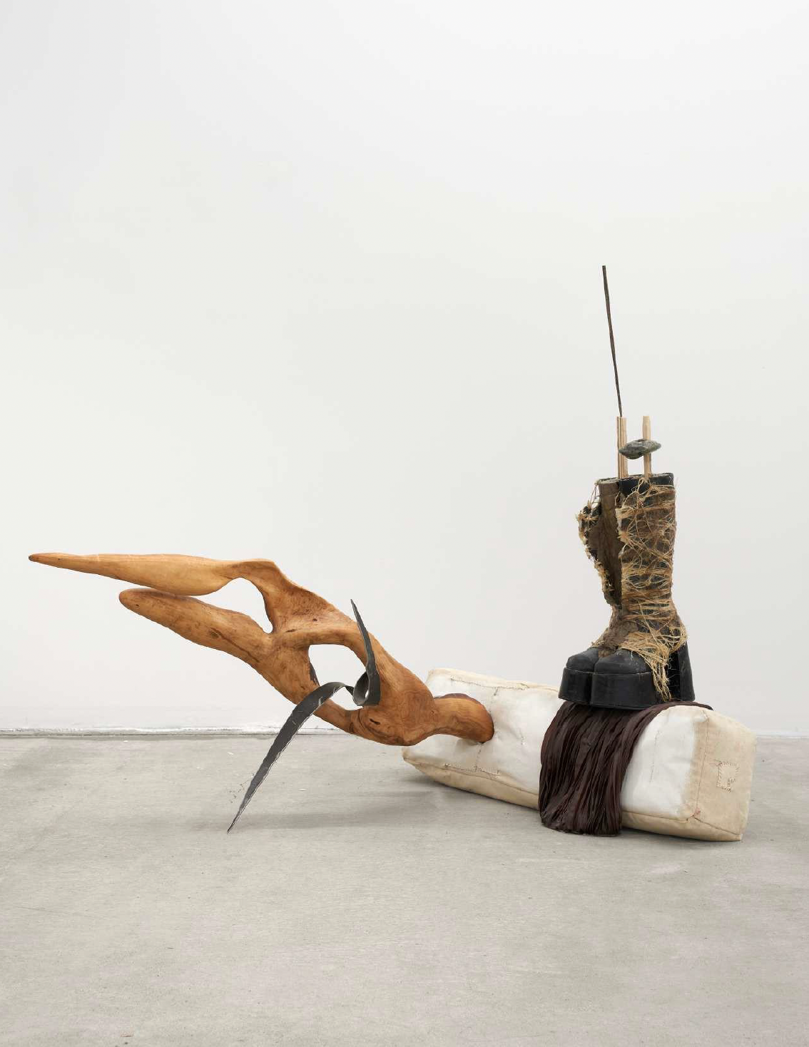 Untitled (not privy), 2024 Steel, apple wood, canvas, gesso, artist’s shoes, concrete, soapstone, plywood, twine, gel medium, horse hair, fabric, resin. 36 x 56 x 26 1/2 inches. Courtesy of the artist.