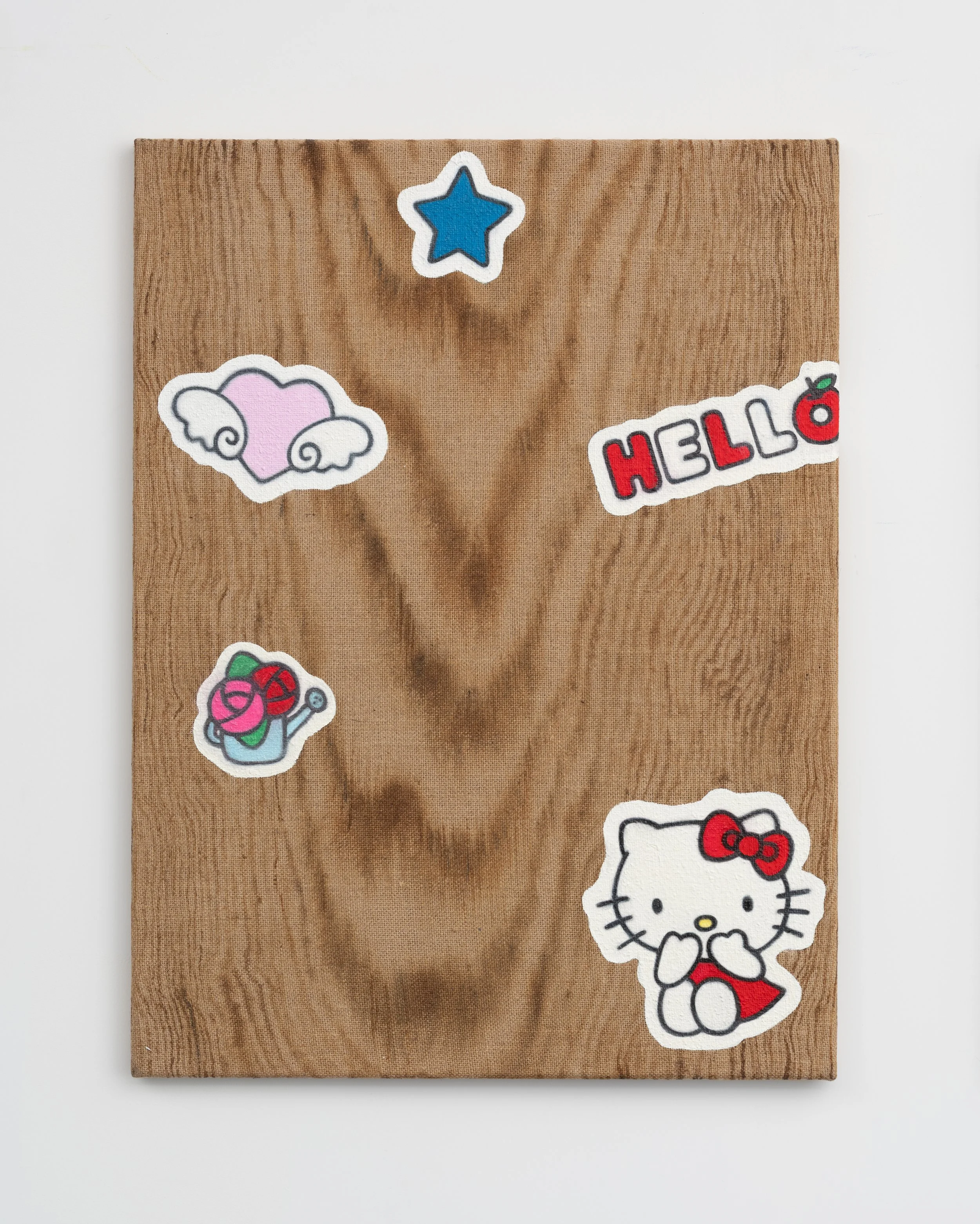 Kitty Sticker on Wood, 2026. Oil on jute, 80 x 60 cm. Photo by Adam Reich. Courtesy of Meredith Rosen Gallery.