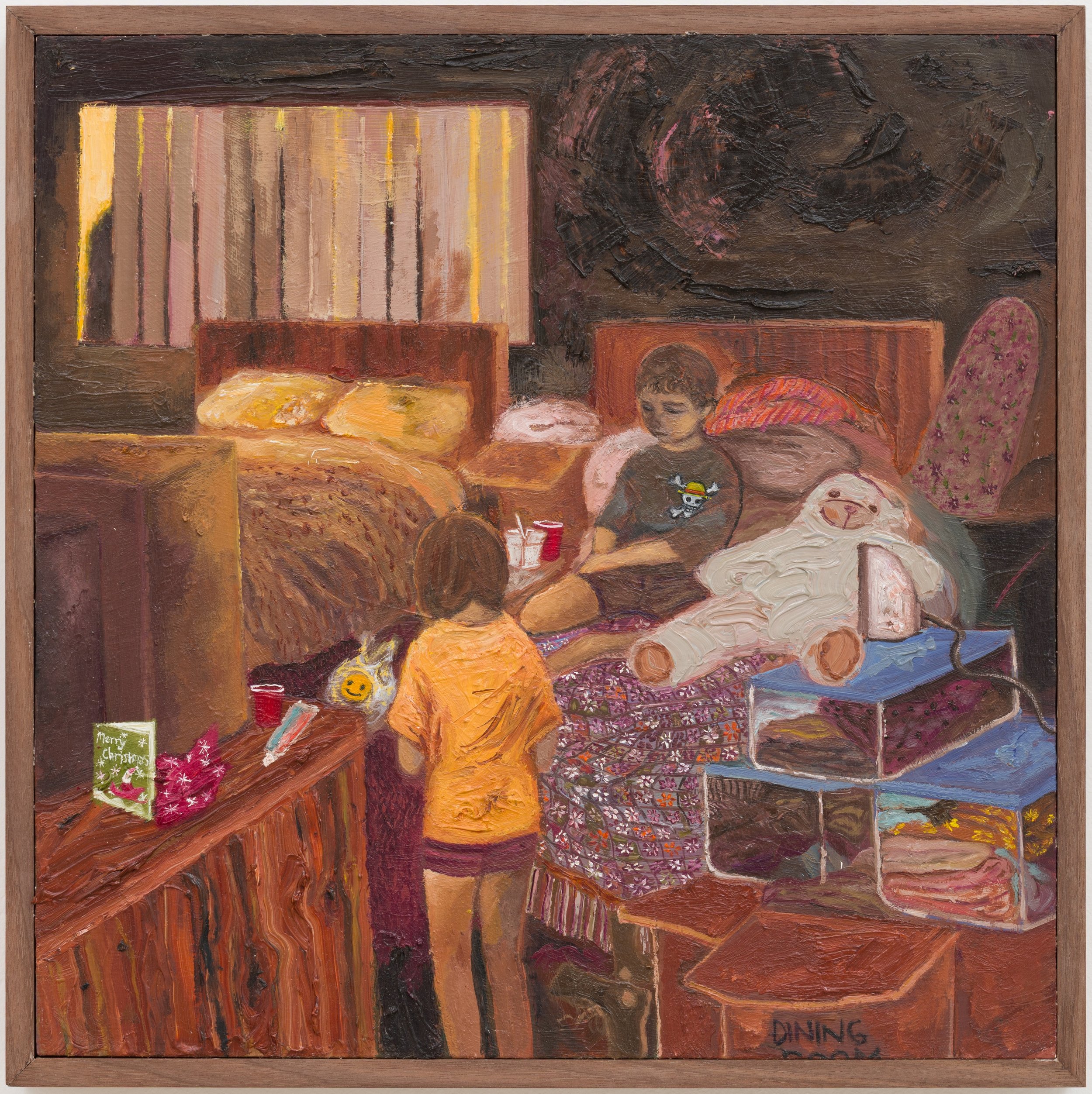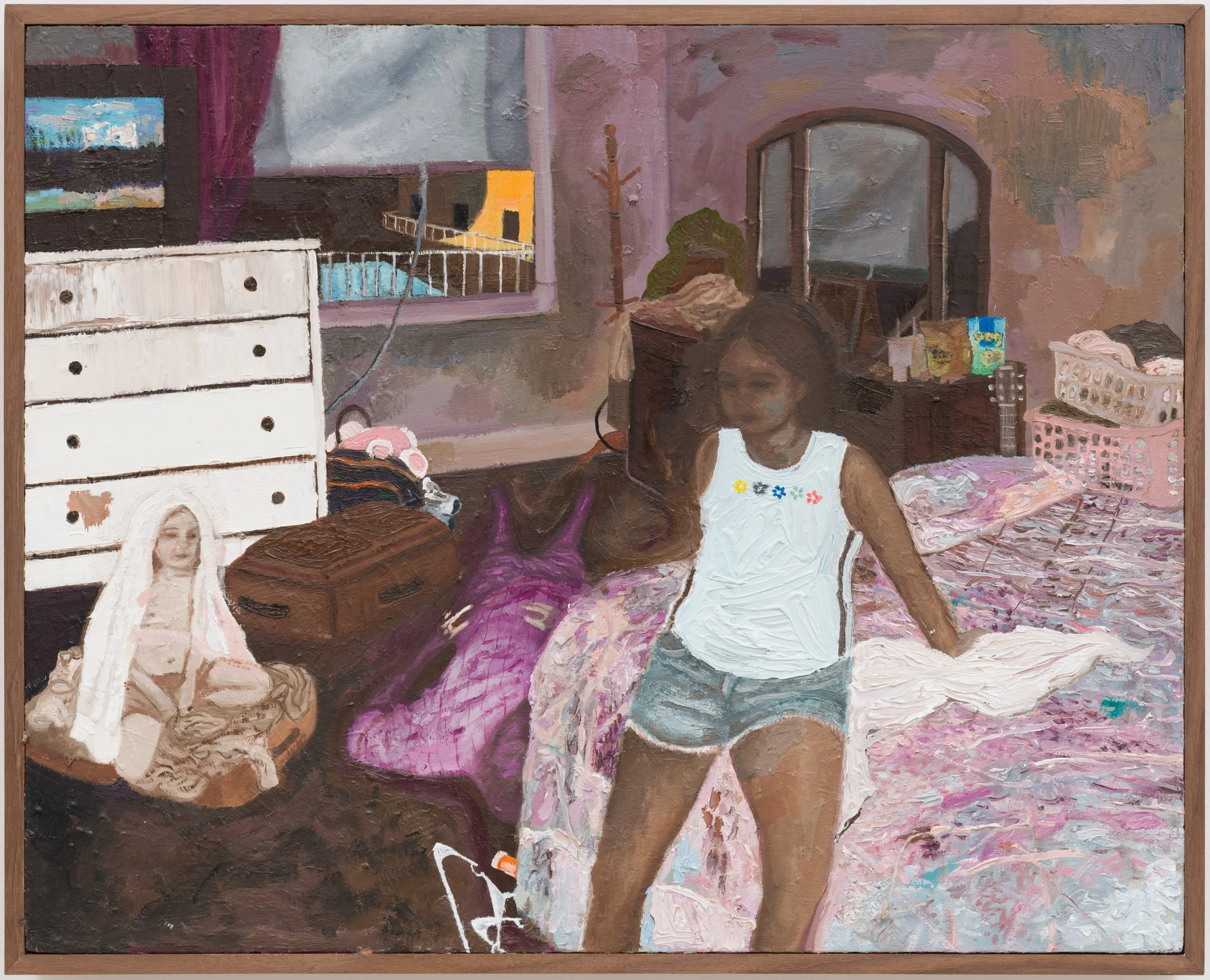 Fernandez draws from an upbringing marked by frequent moves and periods of housing precarity across multiple states. Her work navigates the psychological landscape of houselessness, family memory, and domestic instability, transforming recollection into layered figurative compositions that hover between clarity and distortion. Rather than avoiding the discomfort of these realities, she confronts them directly, reconstructing motels, temporary bedrooms, and shared interiors through a process that filters lived experience through imagination. Memory becomes both subject and material in her hands, stretched across saturated color, shifting perspective, and scenes that feel at once intimate, tender, and unsettled—spaces that remember more than we often do.