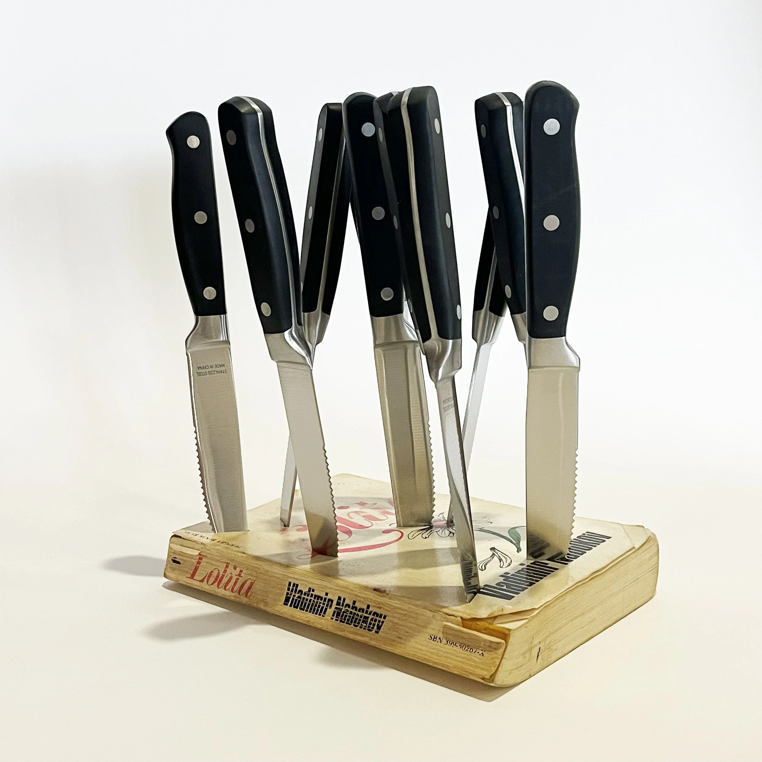 Ten of Swords, 2025. Sculpture, 10 steak knives, Lolita by Vladimir Nabokov. Courtesy of the artist